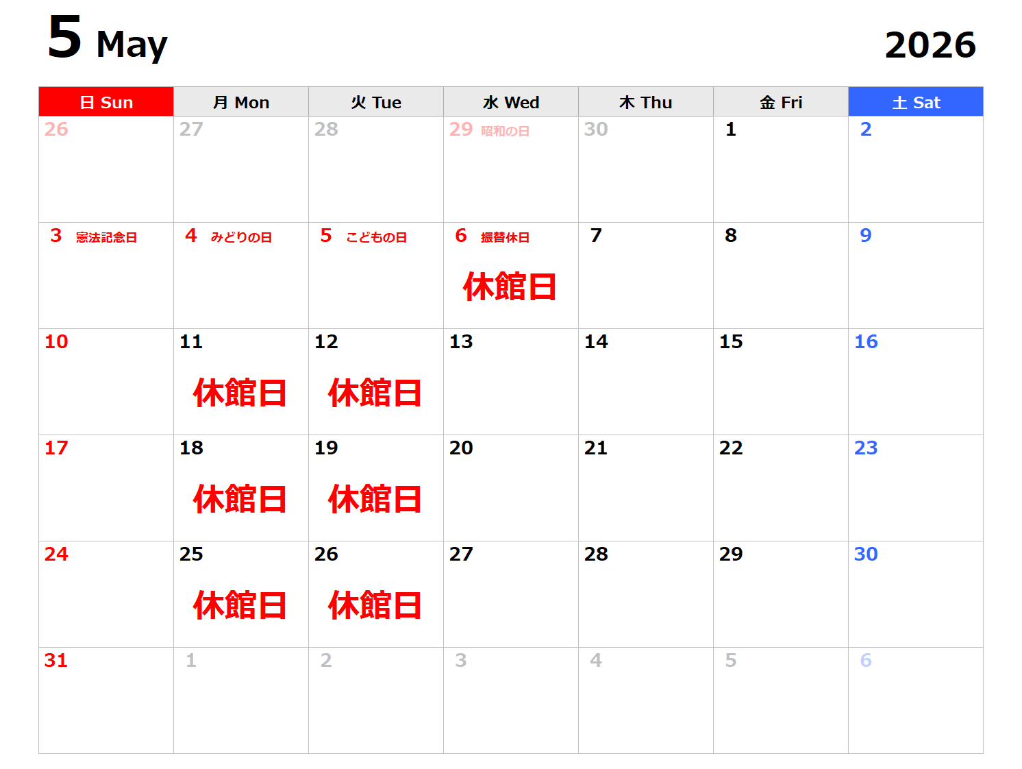 5月の休館日ご案内