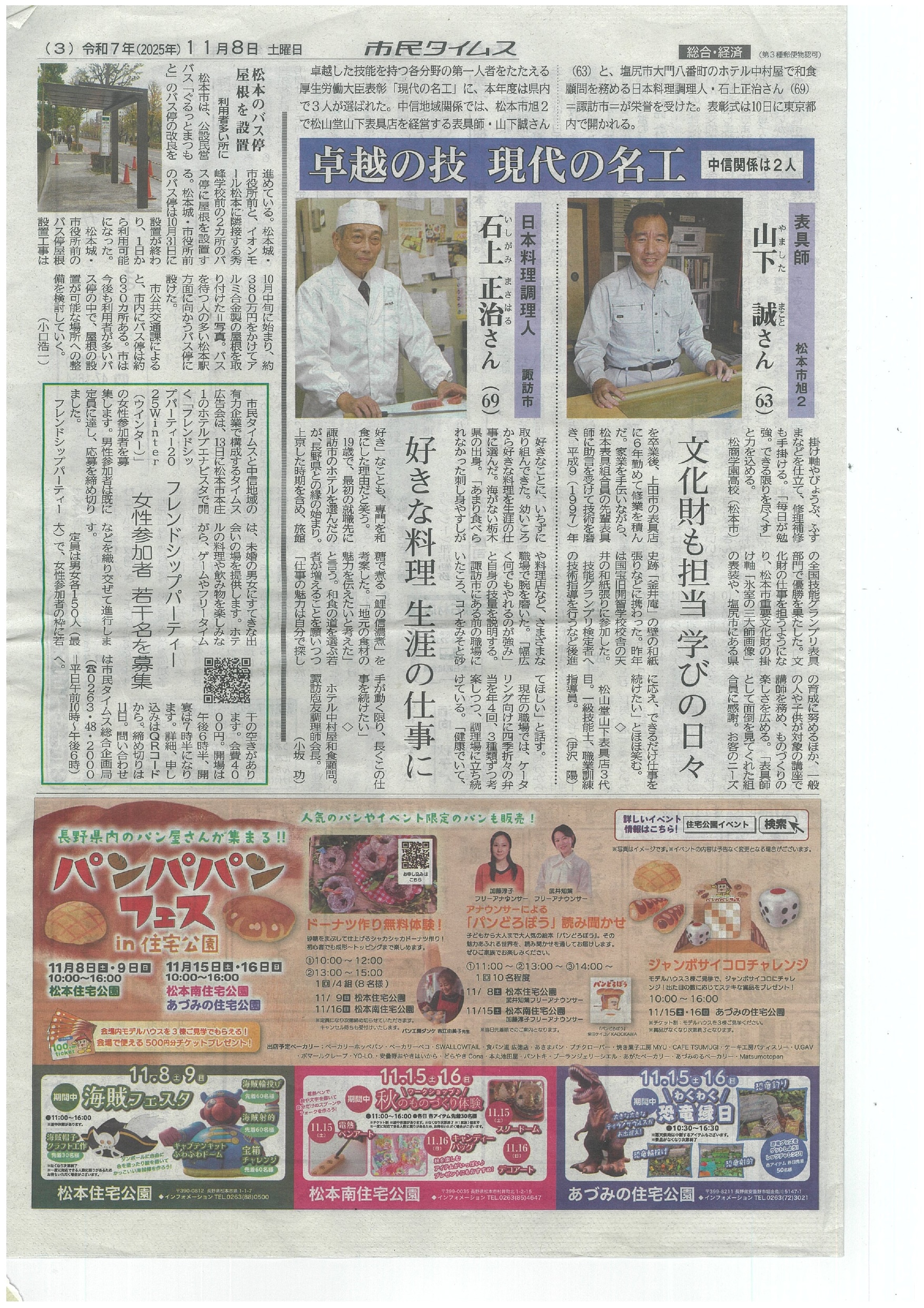 このたび、ホテル中村屋の総料理長石上 正治(いしがみ まさはる)が、卓越した技能者へ贈られる栄誉ある称号 「卓越の技 現代の名工」 に選ばれました。